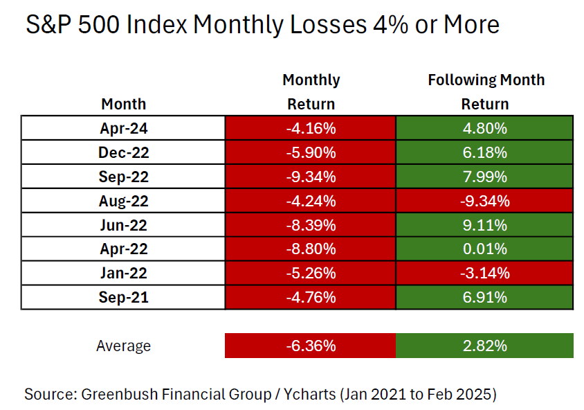 For the 8 months that the S&P 500 Index dropped by over 4% in a single month between January 2021 and February 2025, -6.36% was the average monthly drop in the S&P 500 Index during that 8 month period. The S&P 500 was down 5.8% for the month of March.
