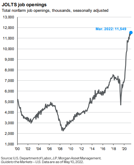 Currently there are 5.9 million unemployed people in the U.S., and as of March there are 11.5M job openings which puts us at 2 job openings for every 1 person looking for work. If you look at the chart below of the total job openings, it’s easy to see that we are in uncharted territory here: